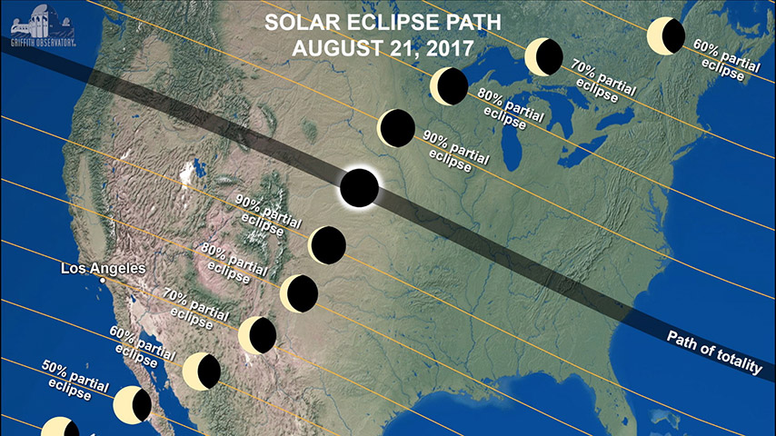 If you can’t get to the path of totality for the solar eclipse, Griffith Observatory will host a public viewing event for the partial solar eclipse on our front lawn from 9:00 a.m. to 12:00 noon on Monday, August 21. The Stellar Emporium gift shop will be open (and selling eclipse viewers). The Café at the End of the Universe and the historic level of the Observatory building (home of the Observatory’s coelostat, or solar telescope) will also be open.