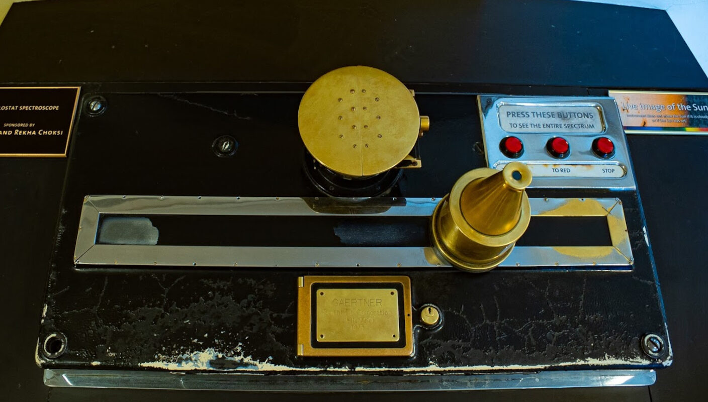 A spectroscope separates sunlight into a colorful spectrum. Some elements in the Sun’s photosphere absorb light and make dark lines in the spectrum. The positions of the lines indicate which element is present.