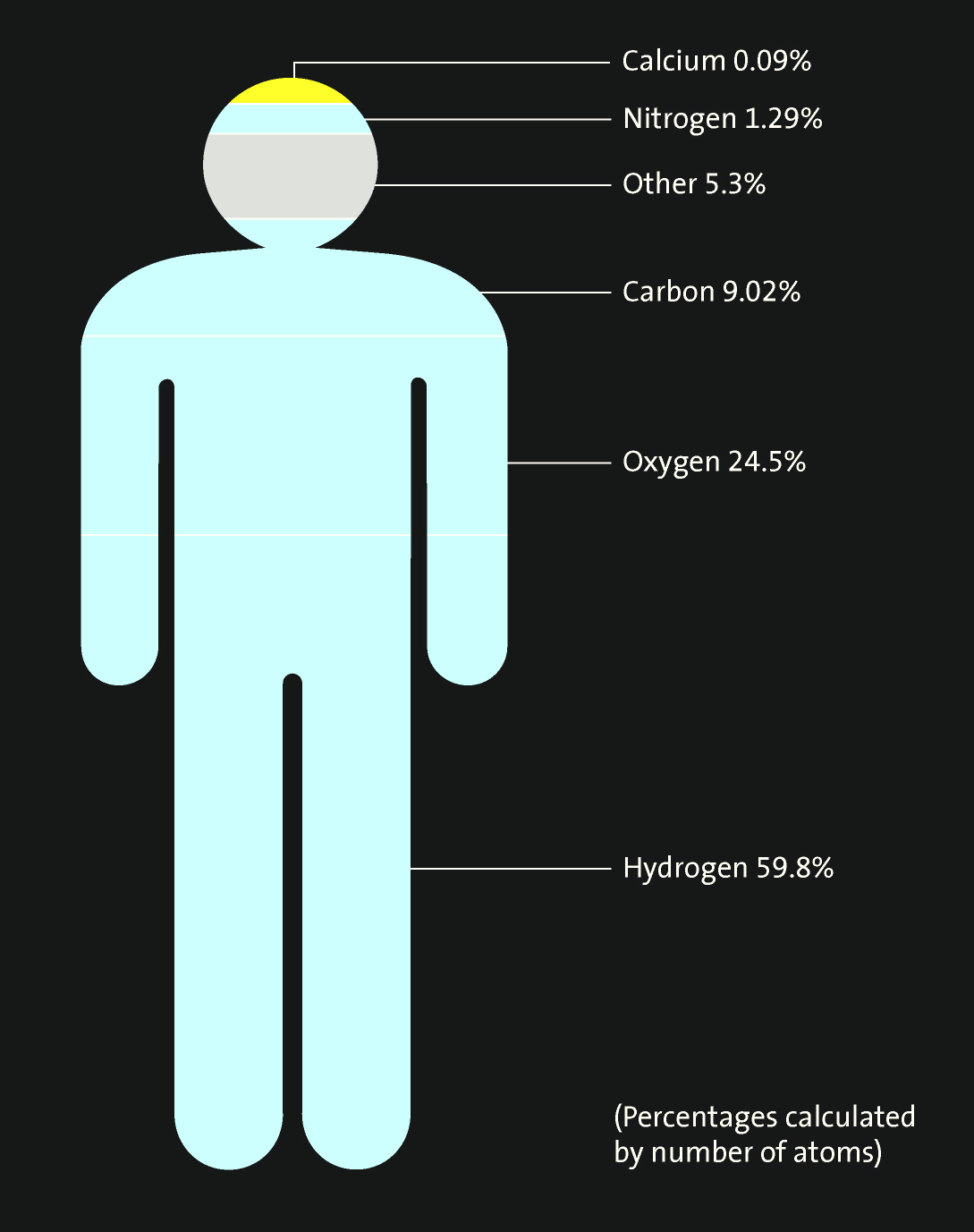 The human body is mostly hydrogen and oxygen, with traces of other elements (color coded to the elements table).