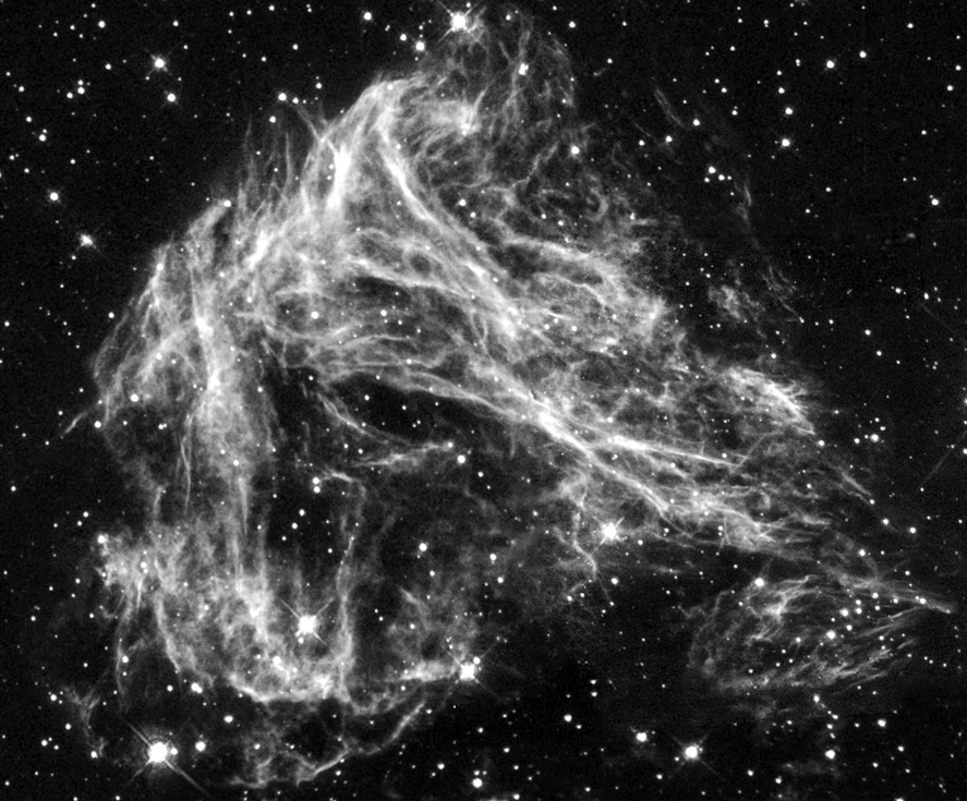 This wispy nebula (LMC N49) is the graveyard of a star that exploded as a supernova. Material in the cloud may become new stars.