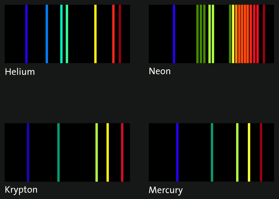 Light from celestial objects identifies the chemical elements they contain. Each element has a specific fingerprint, which we can see with a spectroscope. Helium and neon are made inside stars. Helium’s spectral fingerprint is simple, while neon has many more lines. Elements like krypton and mercury are created in supernova explosions.