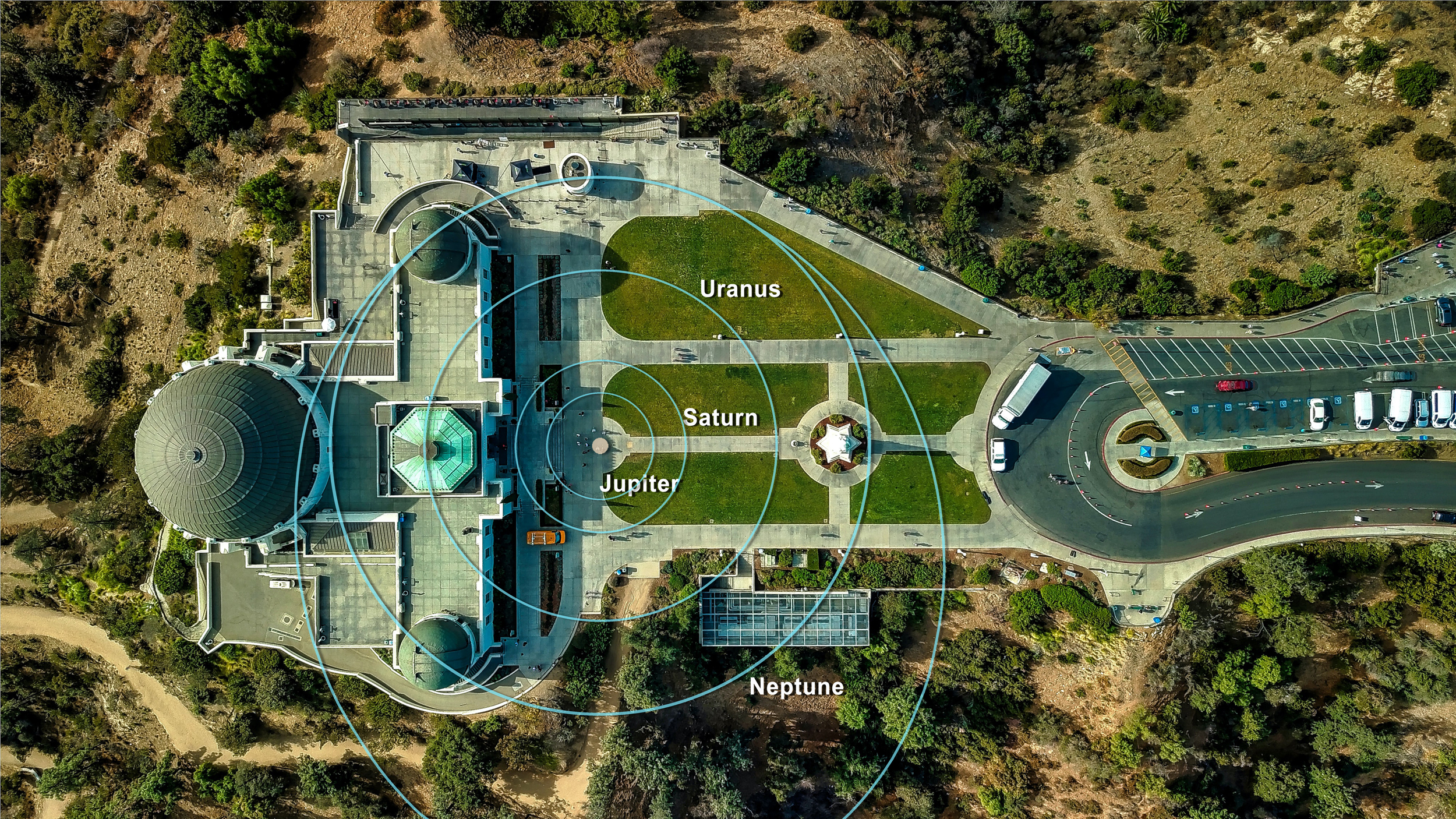 Where in the building: Solar System Lawn Model (front lawn), Gunther Depths of Space exhibits