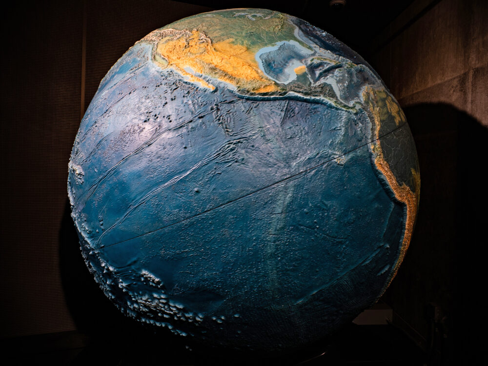 A bronze statue of the most famous scientist of the 20th century holds up his finger to measure the sky seen in the Big Picture across the gallery.
