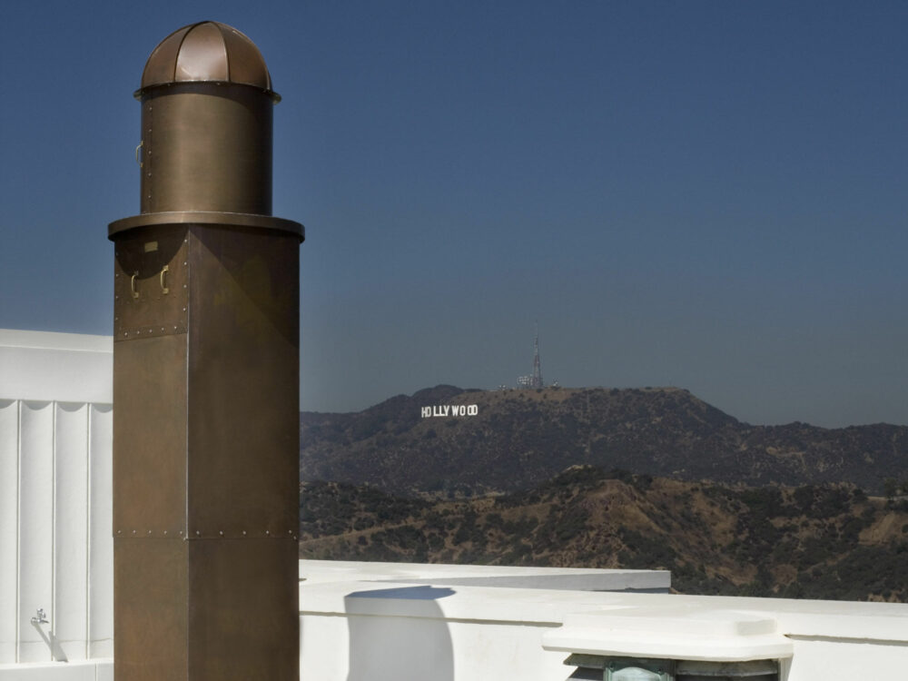 The camera obscura may seem like it depends on magic, but it is a really a simple piece of optical equipment. It projects an image of the outside world into a dark room through a pinhole. The camera obscura on the Griffith Observatory roof uses a mirror and rotating turret to produce the reflected image seen here.
