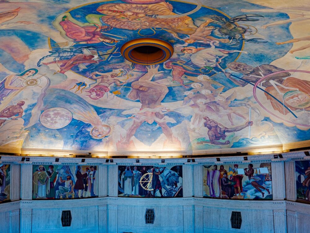 On the vaulted ceiling and upper walls of the W. M. Keck Foundation Central Rotunda are Griffith Observatory's greatest artistic treasure: the Hugo Ballin Murals. Workers have carefully and completely restored the murals so that they appear as they did when first painted by muralist, film producer, and author Hugo Ballin in 1934.