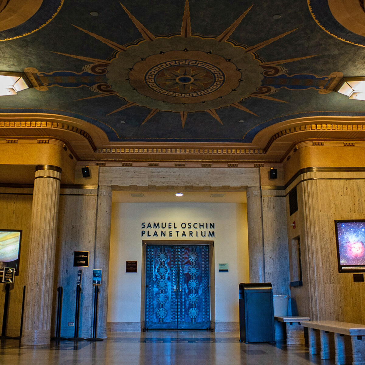 The South Gallery connects the entry to the Samuel Oschin Planetarium, the W.M. Keck Central Rotunda, and Gravity’s Stair, which leads down to the lower levels of the building. Covering the entire ceiling of the South Gallery is a spectacular mural, painted by A. B. Heinsbergen, which depicts the Sun with rays emanating outward. The walls of the gallery are home to ten iconic images from astronomy and space exploration.
