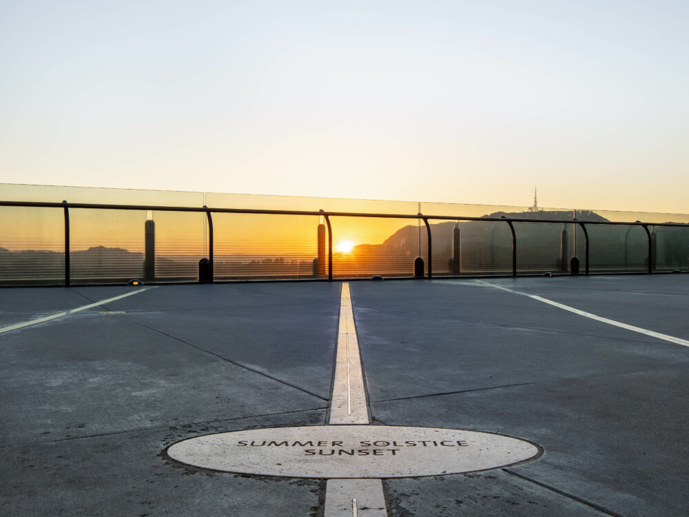 Seven stone and bronze lines embedded in the lower West Observation Terrace radiate out from the building toward the western horizon. Each line points toward a notable sunset or moonset position on the horizon.