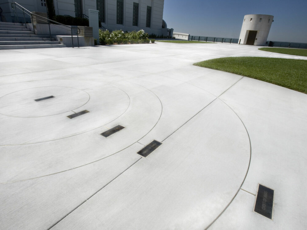 Engraved in the front sidewalk of Griffith Observatory is a scale model of our solar system. One-quarter-inch-wide bronze lines mark the orbits of the planets, which are indicated with bronze plaques also embedded in the sidewalks.