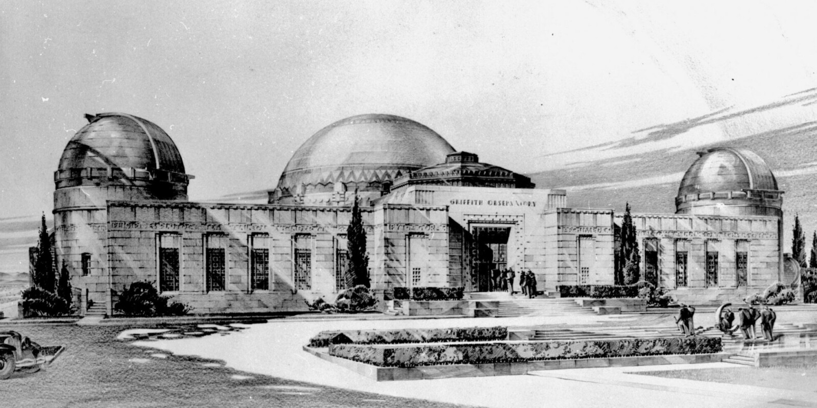 Griffith Observatory was shaped not only by the minds of scientists, but also by the times in which it was built. A major earthquake in Long Beach in March 1933 — just as construction plans were being finalized — led the architects to abandon the planned terra cotta exterior in favor of strengthening and thickening the building’s concrete walls. Lower-than-usual prices caused by the Great Depression enabled the selection of the finest materials of the day for the interior walls, floors, and finishes, making the building both beautiful and durable. And a depression-era Federal public works program employed six sculptors to create a public sculpture at Griffith Observatory. The resulting Astronomers Monument, dedicated in November 1934, was hailed as one of the most important pieces of art to be completed by the program.